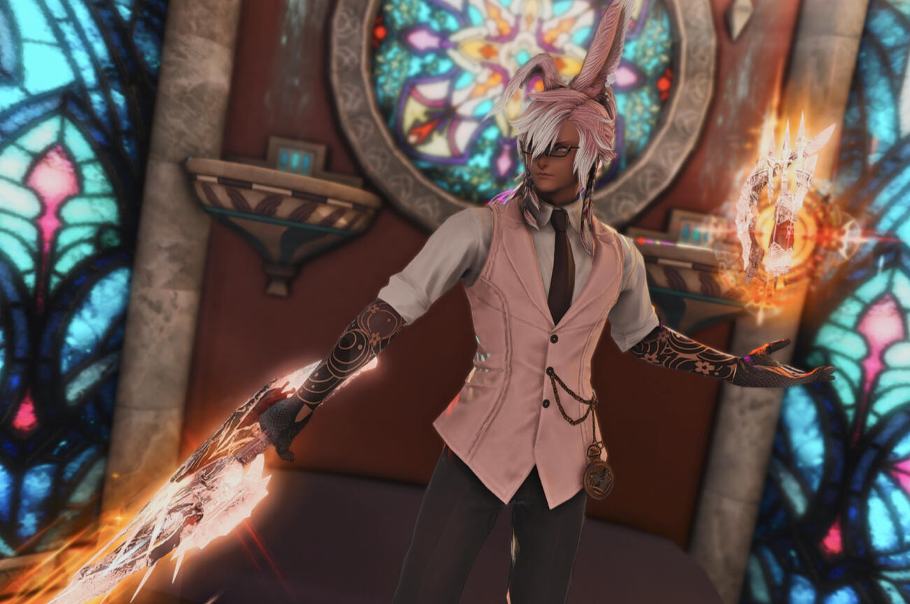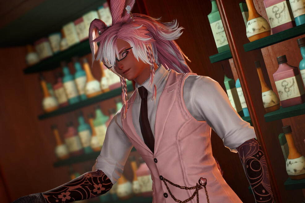 Data Center: AetherA mysterious yet charming gentleman that originally hailed from the jungles of Golmore like his Viera bretheren, he set out to make something of himself in Eorzea and never looked back. Though he is still relatively young, his calm disposition and friendly demeanor earned him a place amongst the Eorzean diaspora, proving himself to be highly capable at whatever he sets his mind to mastering.Interestingly, though it is tradition to banish the Viera men who forsake the Green Word, Vynas still interacts and frequents his home village, mingling with his bretheren who couldn't find the will to exile him. His charismatic outlook on life earns him the respect and admiration of the people around him, whether he likes it or not. He does have a soft side he dares not show to others, however...The alias 'Among Us' was a city name that he picked up as soon as he left the forest, a somewhat tongue-in-cheek reference to how he himself was a stranger in a foreign land. He quickly found himself with a respectable reputation as a seasoned bartender, crafting strong drinks with a smile and flamboyant flair, all while giving his patrons a