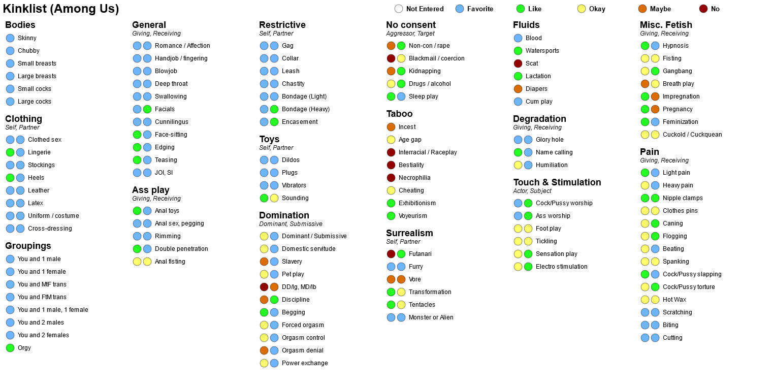 - The kinklist doesn't capture everything I'm into, so please ask about anything you're not sure of and we can work it out 💙 I used to participate in my local IRL kink scene, so I'm open to most things